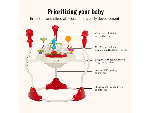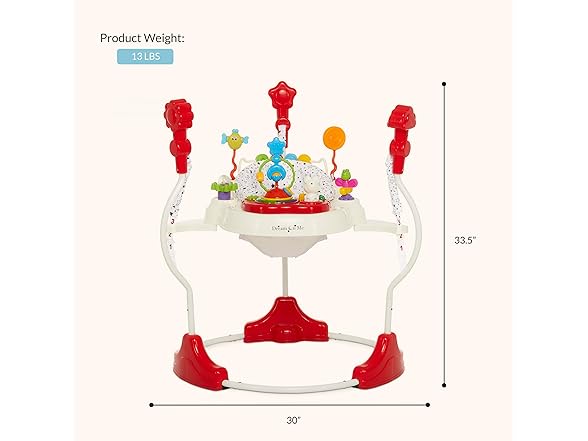 - Dual Use Design – Functions as a secure activity center with lights, music, and toys, and doubles as a stationary bouncer, creating a safe and engaging play area.