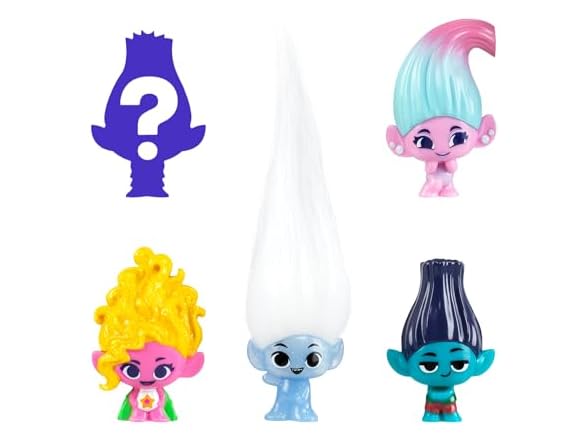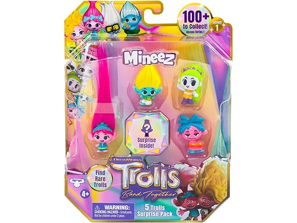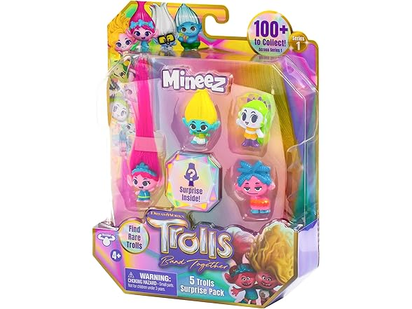 Meet Trolls Mineez! All your child's favorite characters from DreamWorks Trolls Band Together are now Mineez! Cute mini collectible toy figures that capture all the charm, color and fun of these lovable characters! Collect over 100 different Trolls figurines with awesome looks and finishes, including rare, ultra rare and limited editions! Kids will love building up their collection with the 5 Trolls Surprise Pack. This fun-filled pack has 4 Trolls that are visible and 1 surprise Troll hiding inside behind the gem. Collectors will love the excitement of opening up these 5 Packs and discovering who they have found. Maybe they will find a HairRageous Troll with real hair! Each 5 Trolls Surprise Pack contains five 1.5" Trolls figures and 1 surprise accessory for the Mineez to use. Children will want to seek, find and collect them all! Trolls Mineez will win the hearts of Trolls fans - new and old as they sing, dance and be happy (just like Trolls do) with Poppy, Branch and all their friends!