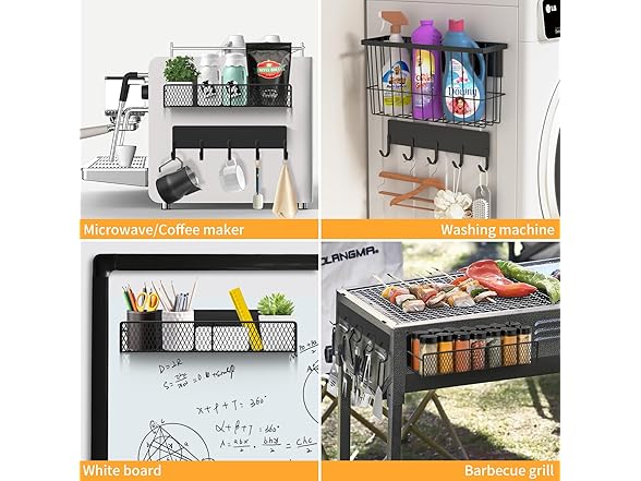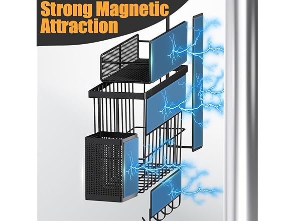 - Strong Magnets, No Drilling Needed. Powerful rubber magnets on the back hold tight to your fridge, washer, or any metal surface – even when fully loaded. No tools, no hassle – just stick and go. Perfect for renters or anyone who loves a quick setup.