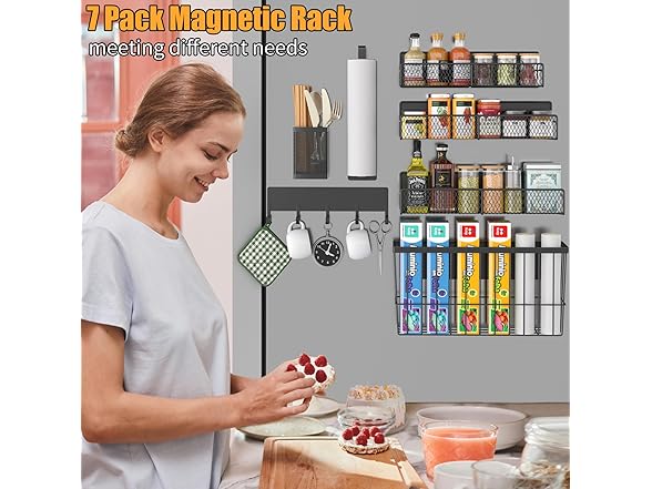 - 7-Piece Magnetic Kitchen Helper. Your all-in-one storage solution with 1 extra-large + 1 large + 1 medium spice racks, 1 paper towel holder, 1 hook rack,1 utensil caddy and 1 cutting board holder. Perfect for organizing spices, towels, and kitchen tools in one go.