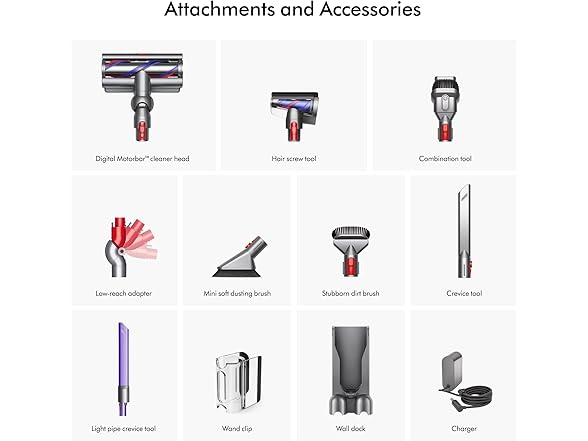 - Includes: Combination Tool, Low-reach adapter, Docking Station, Mini soft dusting brush, Light pipe crevice tool, crevice tool, Charger, Hair screw tool, Digital Motorbar, Stubborn dirt brush, and wand clip