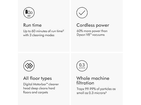- Intelligently optimizes suction and run time across all floor types. Dyson DLS technology automatically senses and adapts to changes in floor type to extend run time. The right balance of power and run time when you need it.