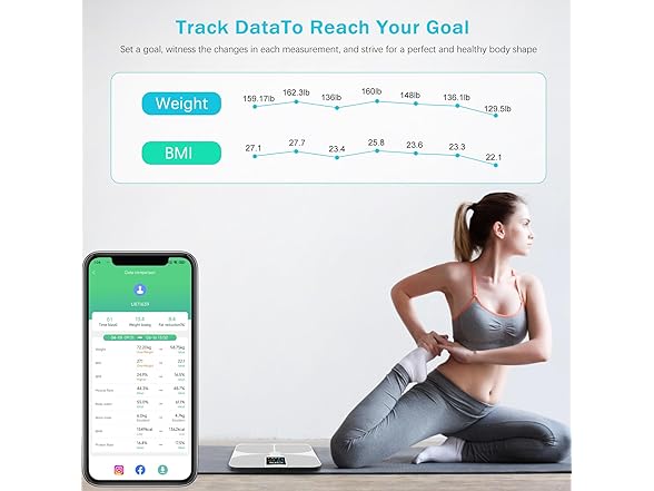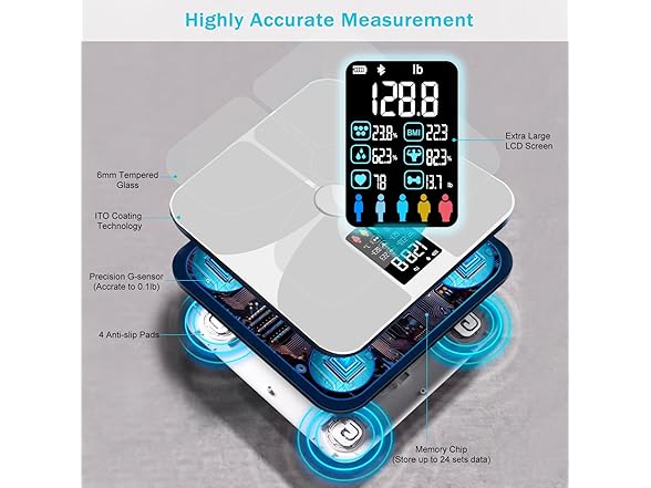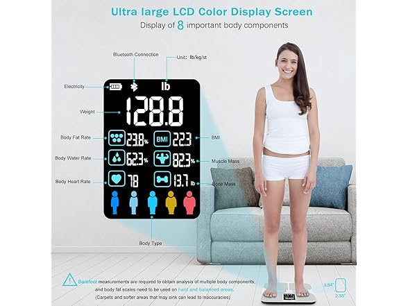 - Ultra large LCD display screen: E-SHIDAI large color LCD screen body fat scale, in addition to the application display screen on the phone, can also directly display your weight and seven other major body composition readings on the scale. The large and easy to read vertically aligned (VA) LCD panel provides the best contrast and color, perfectly presenting your body composition indicators. In order for the scale to recognize you and display seven other data points besides weight, you need to create a personal profile and weigh your weight once through Bluetooth connection