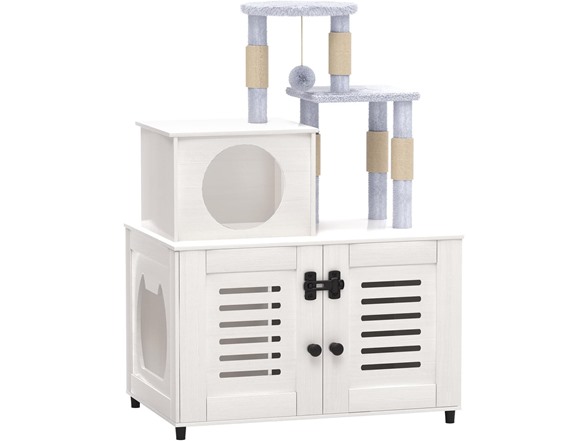 EasyCom Litter Box Enclosure, Hidden Cat Tree Tower Furniture for Indoor House, All-in-one Wooden Cat Litter Cabinet with Scratching Post and Condo