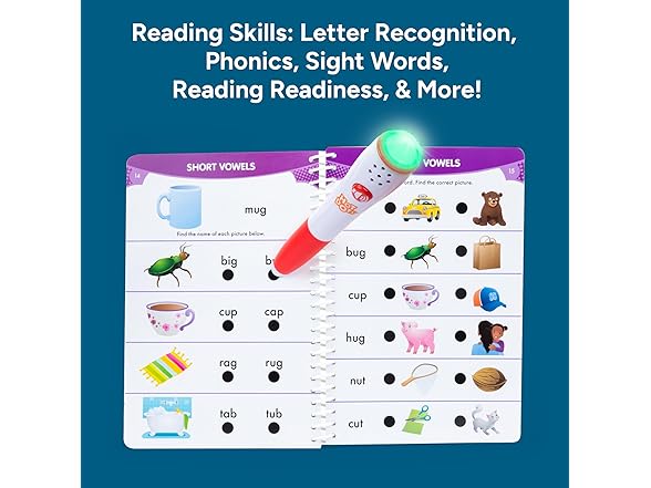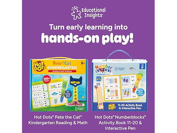 Learn to read with Hot Dots! Help kindergarteners practice their reading skills, or get a head start on kindergarten readiness skills. This interactive set covers all the reading fundamentals that kids need to succeed in kindergarten and beyond. Hot Dots are interactive so kids can learn at their own pace, self-correct, and build confidence with the interactive pen. How does the pen work? When you press it to an answer dot, the pen lights up; green for correct answers, red for incorrect. The pen can also play sounds or be muted; the pen does not talk. Make learning interactive with Hot Dots! At Educational Insights we've been helping kids learn through play for 60 years. We work with experts in distinct fields to ensure that our products are the very best they can be. Our award-winning, best-selling toys and games—Kanoodle®, Design & Drill®, Playfoam®, GeoSafari®, and more—spark new interests, unleashing limitless possibilities.