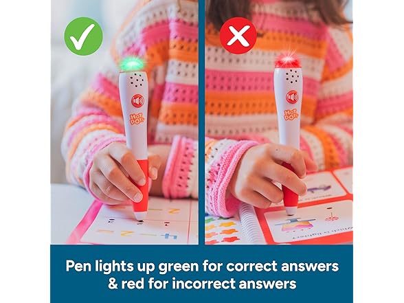 - HOW IT WORKS: Press the Hot Dots pen to an answer dot and get immediate visual and audio feedback! Pen lights up green for correct answers, red for wrong answers, and plays sounds (can be muted)