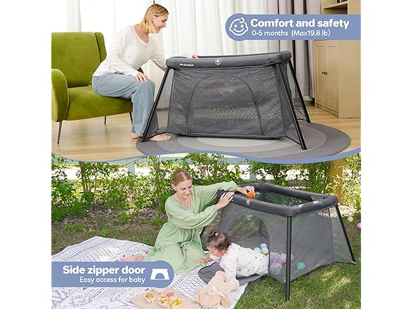 - 【2 IN 1 Portable Travel Crib】baby crib: Detachable second floor bed,can hold a maximum of 19.8 pounds of baby,travel to give baby comfortable sleep;Playard: Remove secondary bed to form a Playard, and with side zipper the baby can enter and exit any time