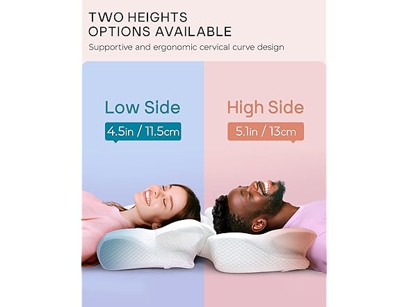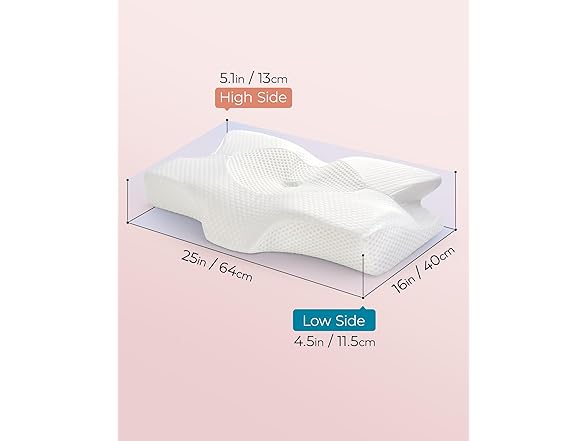 - DUAL-HEIGHT DESIGN FOR CERVICAL SUPPORT: SIZE 63*(11.5/13.5)*40.5cm/25 x (4.5/5.3)*16inch (L*H*W): Back sleepers with cervical issues can benefit from using the higher side (5.3 inches) of the orthopedic pillow, designed with dual horns for enhanced head and neck support, ensuring proper alignment with the body. The neck support pillow is suitable for different sleeping positions: back, stomach and side sleeping.