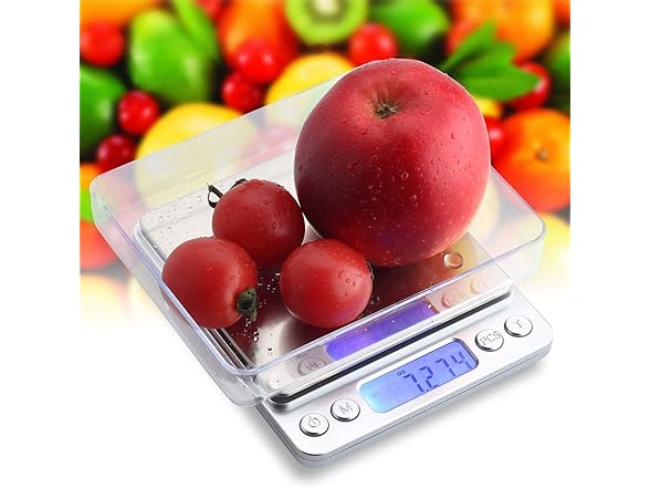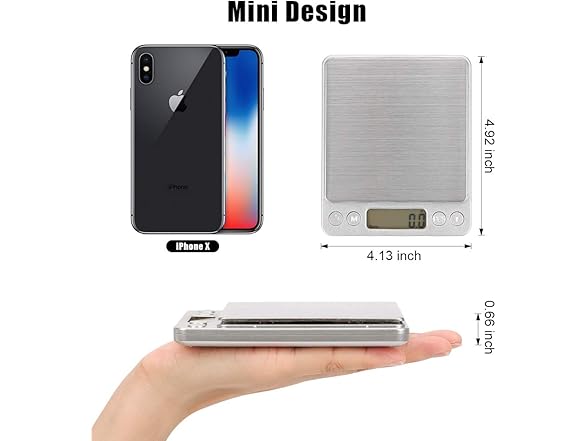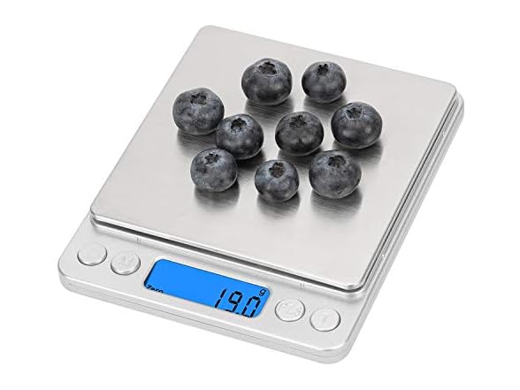 High quality kitchen scale makes your life healthier Features: 1. Equipped with high precision sensors to provide the most accurate weight readings. Maximum weight: 500g, Accuracy: 0. 01g /0. 001oz 2. Quick unit conversion between g, oz. , oat, dwt, CT, gnu 3. Stainless steel wire drawing scale, ABS plastic frame Ultra-thin design, easy to carry, easy to clean . 4. Features a clear blue back light LCD screen. 5. Fast and easy to tare and calibrate 6. Auto off: 180 seconds of inactivity 7. Function Buttons: Power / Mode / PCS / Tare Package Included: 1 x food kitchen scale 2 x Trays 1 x User Manual Note: Weight less than 3g may decrease the accuracy of the scale. Warm Tips: 1. Do not immerse the kitchen scale in water or use chemical/abrasive cleaning agents to clean it 2. Please use the food scale on hard and flat surface. Do not use on carpet. 3. Overweight items will make the readings are not accurate.