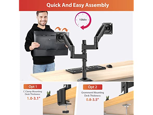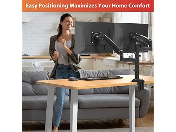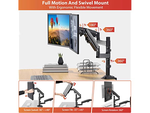 - FULL MOTION BRINGS CONVENIENCE: This gas spring dual computer monitor stand allows your screens to swivel from -90° to +90°, tilt from -35° to +85°and rotate 360° to get an optimal orientation for efficient work.