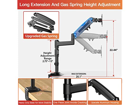 - GAS SPRING HEIGHT ADJUSTMENT: You can easily adjust the gas spring arm by socket wrench. The vesa arms can be adjusted on the pole from 2.75"~13". And the monitor arms has 10.8" of height adjustment range for eye level.