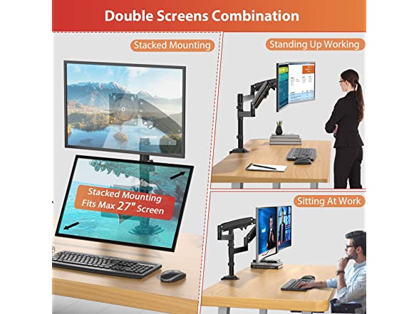 - STACKABLE DUAL MONITOR MOUNT: It fits two monitor screens up to 27" when stacked. This height adjustable dual monitor arm desk mount elevates your monitor to an ergonomic height to reduce neck strain and make you work and play in a comfortable position.