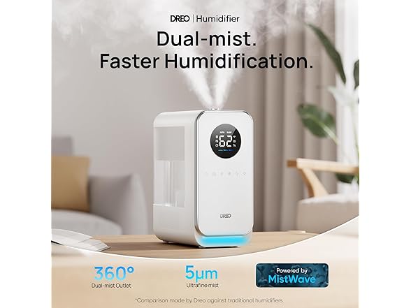 - 𝐒𝐮𝐩𝐞𝐫𝐬𝐢𝐳𝐞𝐝 𝐌𝐢𝐬𝐭: DREO's Dual-intake and 360° dual mist outlet design, enables you direct mist into multiple directions, DREO humidifiers for home bring fast dryness relief and release more uniform and comfortable air to breathe better.