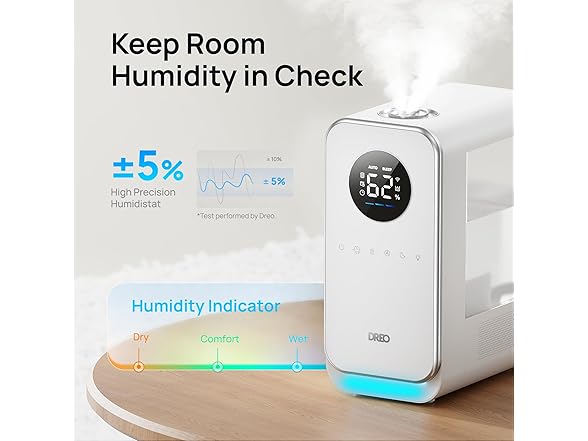 - 𝐈𝐧𝐭𝐞𝐥𝐥𝐢𝐠𝐞𝐧𝐭 𝐇𝐮𝐦𝐢𝐝𝐢𝐭𝐲 𝐂𝐨𝐧𝐭𝐫𝐨𝐥: Choose desired humidity level for living room, and let the humidistat handle the rest. Thanks to accurate sensors and algorithms, allowing the DREO Humidifiers for bedroom to effectively set your target humidity with 5% tolerance.