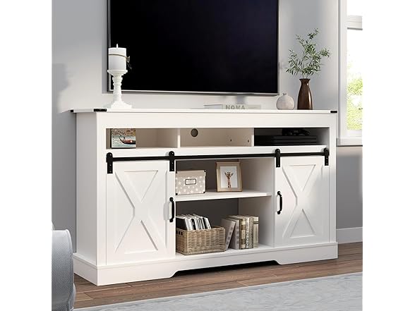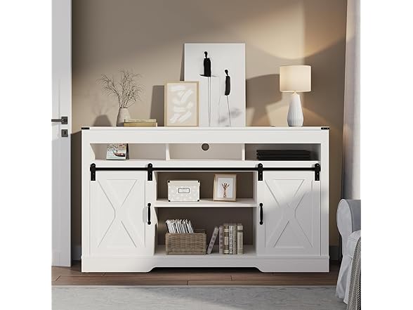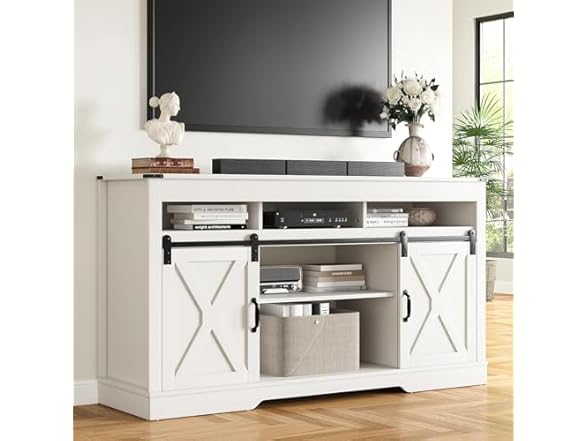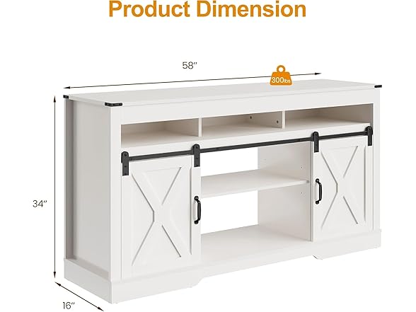 Introducing our farmhouse TV stand, crafted with premium quality and sturdy materials that offer superior durability and easy maintenance. It is designed with a high load-bearing capacity, resistance to deformation and waterproof properties. The flexible design of our entertainment center features sliding doors that provide a hidden storage solution, allowing you to adjust the barn door to your specific needs for maximum privacy and convenience. The doors slide smoothly and silently on the rails, making it easy to access your belongings while keeping them out of sight. With three spacious storage compartments and adjustable shelves, our 65-inch TV stand offers ample storage space to keep your items organized. Whether you need to store books, electronics, or other household items, our console table has got you covered. Additionally, the back cut-out provides easy access for electronic cables, making it easy to connect all of your devices without the hassle of tangled cords. Our modern farmhouse-style design offers a simple and elegant look while providing sufficient storage space without compromising style. It is versatile and can be used in various settings such as a TV stand, office storage or kitchen storage cabinet. The neutral color and clean lines make it a great addition to any home decor style. We provide detailed installation instructions to make assembly a breeze. The media console comes with all the necessary hardware and tools, so you can have it up and running in no time. We also include an anti-tipping device for added safety, so you can rest easy knowing that your TV stand is stable and secure. In conclusion, our farmhouse-style TV stand is a perfect combination of functionality and style. It is built to last and provides ample storage space while looking great in any room of your home. 【Specifications】 Color: White Mearsured Dimension: 58"W x 16"D x 34"H Product Weight: 109 LBS Weight Capacity: 300LBS