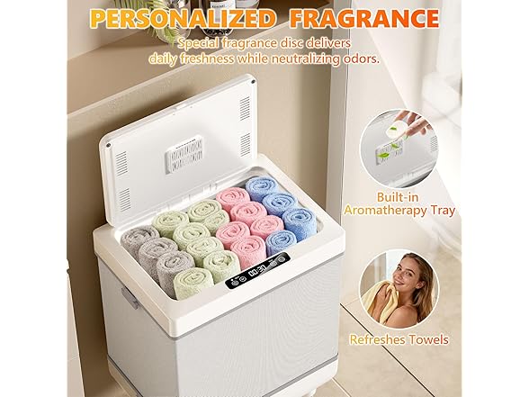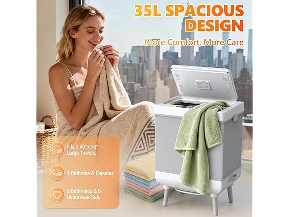 - 【35L Large Capacity Towel Warmer】Designed with an enlarged interior, this bathroom towel warmer easily accommodates up to three oversized 45" x 70" bath towels, along with a bathrobe or personal blanket. With a generous 35L capacity, it is perfect for family use. Safely warms cotton fabrics to deliver a spa-like experience at home; please avoid heating synthetic fibers, damp towels, or non-heat-resistant materials
