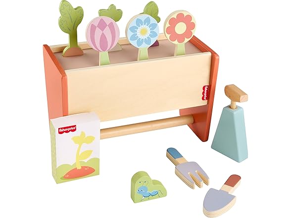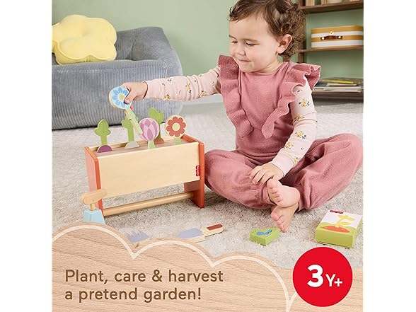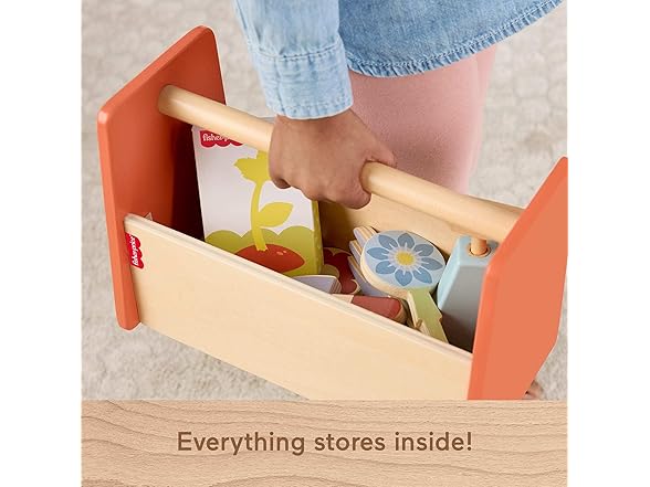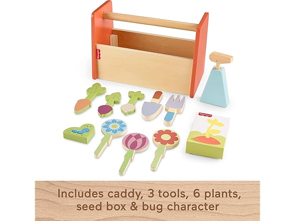 Fisher-Price Wood Pretend Play Toy Tiny Garden Caddy, 12-Piece Set with Wooden Tools & Plants for Preschool Kids Ages 3+ Years