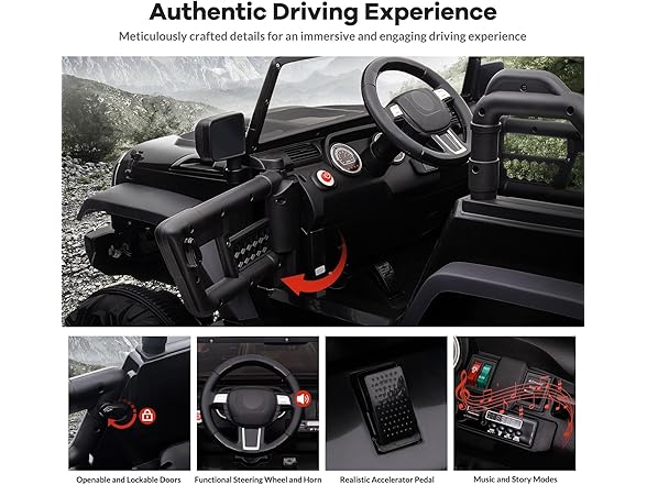 - [AUTHENTIC DRIVING EXPERIENCE] - This carefully designed Fitenlor 2 seater electric vehicle is perfect for big kids ages 3-8, providing a realistic driving experience with features such as openable and lockable doors, a functional steering wheel and horn, a realistic accelerator pedal, and an audio system that plays music and stories through USB, AUX port, and SD card
