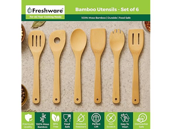 - High-Quality - Our 100% bamboo cooking utensils set is nonstick, odor-resistant, and gentle on cookware. Easy to clean and durable, these wood spoons for cooking ensure fresh, scratch-free prep, cooking, and serving every time.