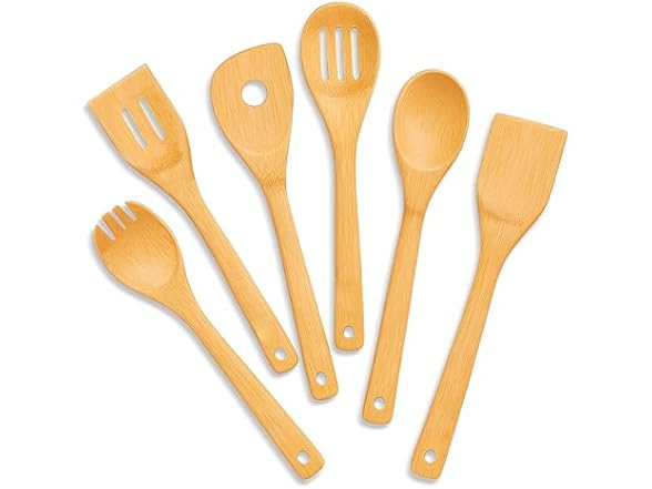 Upgrade your kitchen with this beautifully crafted kitchen utensils set, combining classic design with everyday functionality. This 6-piece wooden utensil set includes slotted, solid, and turner wooden spoons, spatulas, and a versatile spoon fork - perfect for mixing, flipping, and serving. Made from durable, moisture-resistant bamboo, this bamboo cooking utensils set is gentle on cookware and resists stains, odors, and warping. Each piece features smooth handles and contoured heads for comfort and control. Easy to clean and built to last, it’s a must-have for your kitchen essentials. Whether you're a home chef or gifting someone special, this cooking utensils set blends natural charm, sustainability, and performance. Ideal wooden spoons for cooking and all your everyday prep needs - elevate your kitchen with a utensil set made to last.