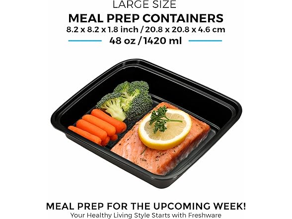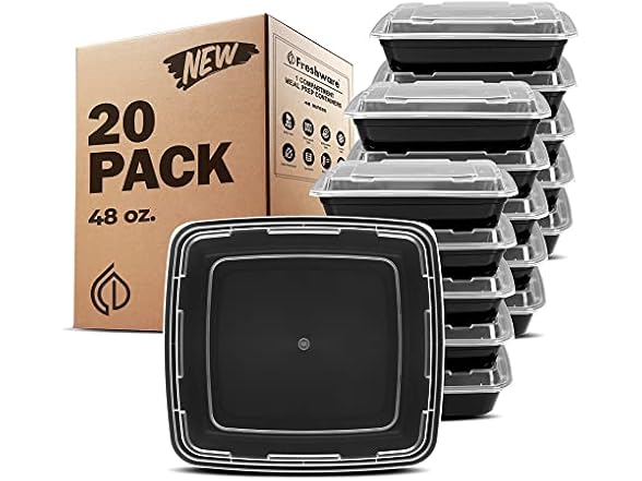 STAY FIT & HEALTHY- Enjoy Delicious Homemade Meals Everywhere With The #1 Meal Prep Containers By Freshware!Are you sick and tired of spending money on buying ready-made unhealthy food?Meet The Ultimate Bento Boxes, Your New Best Friend In The Kitchen!With 1 spacious compartment space, you can use this set of 20 smart lunch boxes for various snacks without them mixing all together. Your meal will look and taste great all day long!Provide yourself and your family with a decent meal of controlled portions with main course, salad and even dessert, all nicely packed in this super convenient lunch box!Supreme Quality & Thoughtful Design Combined!Made exclusively of 100% food-safe, BPA, PVC and Phthalate free Polypropylene, these reusable plastic containers are the safest choice you can make.Thanks to their unmatched quality you can:✅ Prepare more meals in advance and freeze them for the busy days when you won’t have time to cook.✅ Microwave them to enjoy a delicious hot meal.✅ Clean them hassle free in the dishwasher!Box Size: 8.2 x 8.2 x 1.8 inch. Volume: 48 oz. Lid Size: 8.2 x 8.2 x 0.6 inch. 20-Pack of airtight lids and freshness containers. These Meal Prep / Portion Control / Food Storage Containers are a great new alternative to expensive plastic containers. Perfect for adult lunch box, meal box for work while they are highly recommended by most fitness experts for meal preps, and portion control.GET IT WITH CONFIDENCE: Freshware offers you their FREE Replacement or Refund policy. That’s our promise!Let’s start your Healthy Living Style by adding the BEST Meal Prep Containers by FRESHWARE to your cart TODAY! CHOKING HAZARD – Small parts. Not for children under 3 years or any individuals who have a tendency to place inedible objects in their mouths.