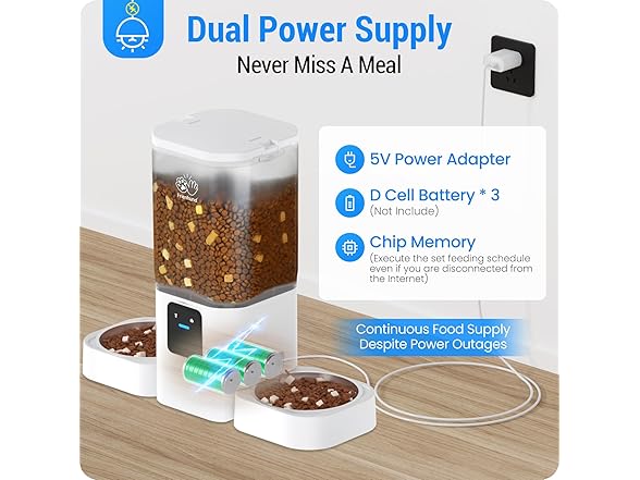 - Dual Power Supply: The cat feeder automatic has two power supply systems. DC 5V power adapter for daily use of the wifi cat feeder. The 3 D cell batteries ensure your pet has a continuous supply of food when your home loses power. You can enjoy your vacation or work away from home with peace of mind( Dual power supply recommended ). The specially made anti-bite nylon braided line of this automatic pet feeder can effectively prevent your line-biting pet from chewing it. This will be your best protection when you go out of town.