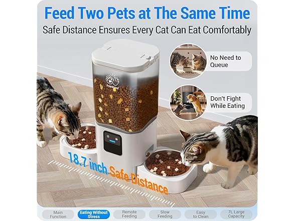 - Dine without Distractions: The two feeding bowls are placed 18.7 inches apart, which can effectively provide a comfortable eating space for your pet. If your two bowls are placed too close, pets will fight for food or wait for the other pet to finish eating before eating. The Frienhund automatic cat feeder is well designed with this in mind.