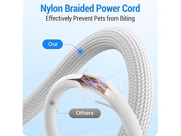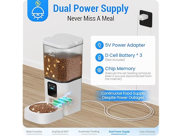 - Dual Power Supply : The automatic dog feeder has two power supply systems. DC 5V power adapter for daily use of the automatic cat feeder wifi. The 3 D cell batteries (not include) ensure your pet has a continuous supply of food when your home loses power. You can enjoy your vacation or work away from home with peace of mind( Dual power supply recommended ). The specially made anti-bite nylon braided line of this automatic pet feeder can effectively prevent your line-biting pet from chewing it.