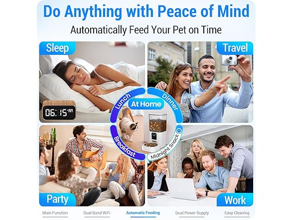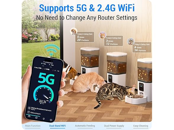 - Dual-band WiFi : The Frienhund cat automatic feeders supports dual-band WiFi (2.4GHz & 5GHz). Dual-band WiFi lets you don't have to modify your router for channel compatibility issues. Faster 5G networks allow for more stable signal.