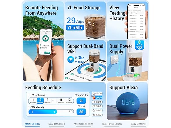 - Remote APP Control : The Automatic cat feeder can connect to 2.4GHz or 5GHz network. Program and monitor your pet's meals anywhere anytime through the “Smart Life” App on your iOS or Android smartphone. You can set up a feeding schedule of up to 30 meals per day, with 1-12 portions per meal. Also reward your pet by feeding it remotely from outdoor via the app. The app can also check feeding records and share to family members' smartphones for control.