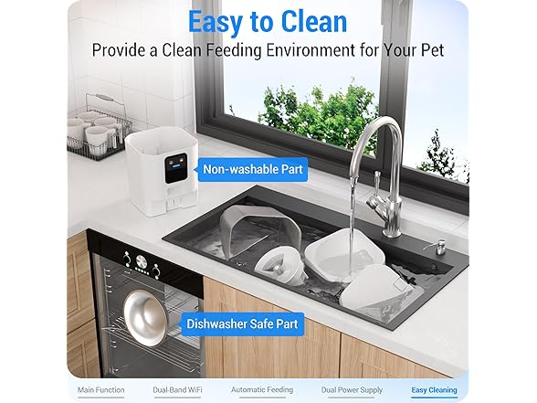 - Clean More Thoroughly ( Detachable ) : The cat feeder (BPA-Free) has a removable food tank and stainless steel bowl. Individually disassembled Food Tank can be cleaned more thoroughly. Stainless steel bowl can be placed in the dishwasher for cleaning. These removable designs make eating more hygienic for your pet.