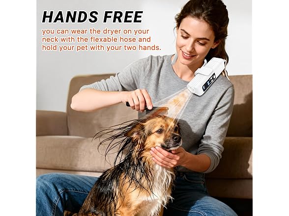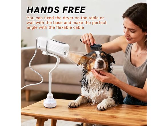 - True Hands-Free Operation for Effortless Grooming This dryer offers two hands-free modes. Use the adjustable hanging strap around your neck to comfortably hold and soothe your pet while brushing. The included sturdy stand allows for fixed, stand-up operation on any table, freeing both your hands entirely. This is ideal for large dogs or extended grooming sessions, reducing arm strain significantly.