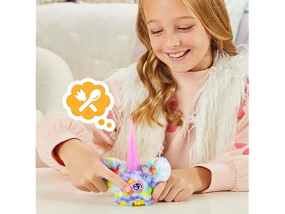 - 3 WAYS TO ACTIVATE MUSIC & PHRASES: Press the beak for fun feeding noises and tap the heart gem for music. The top of the head activates fun Furbish phrases and powers it on and off