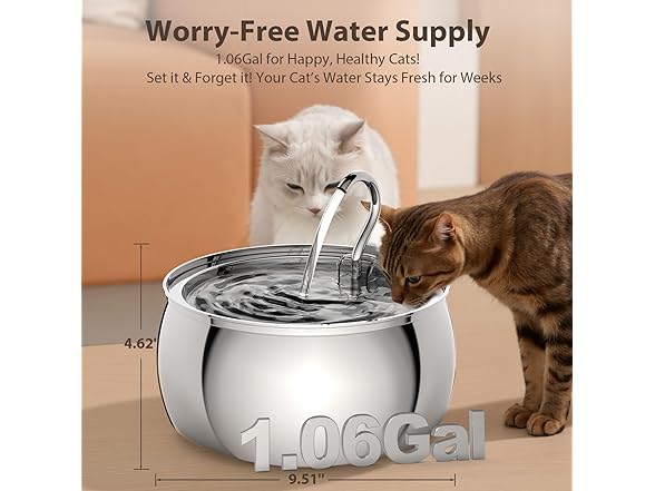 - Large Capacity for Peace of Mind: With a 1.06-gallon (4L) capacity, this stainless steel cat water fountain is ideal for multi-pet households. One fill can meet the drinking needs of an adult cat for 10-14 days, ensuring fresh water is always available, even when you're away.