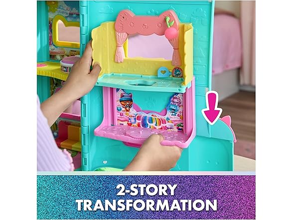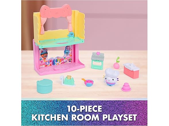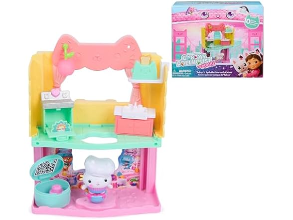 Meow-mazing adventures await with Cakey's Sprinkle Cake-tastic Kitchen! This 10-piece playset brings the magic of Gabby's Dollhouse: The Movie to life, featuring a Cakey figure and a combined 8 pieces of doll house furniture & accessories, for cat-tastic adventures with these learning toys. The Cake-tastic Kitchen is designed to be attached to the dollhouse and transforms into a 2-story dollhouse room, creating an even more thrilling dollhouse world, enhanced by a surprise feature. Place Cakey on the pegged pedestal and pull the room down to teleport him to his movie-world confection land. Unbox the Dollhouse Delivery, just like Gabby does in the show, to find a surprise accessory, then scan the QR code to unlock a surprise in the Gabby's Dollhouse app. This set is a fun-filled way to inspire pretend play and invites meow-mazing explorations, with these adorable Gabby cat toys for kids. Gabbys dollhouse toys are purrfect gifts for kids to relive cherished moments from the Gabby movie, and for creating new adventures in Gabby's dollhouse, with toddler toys for kids, like doll house accessories & furniture, her meow-mazing cat friends and fin-tastic mermaid toys, for endless hours of cat-terrific adventures (each sold separately)