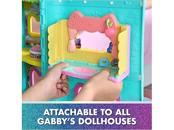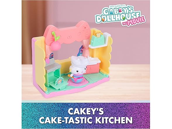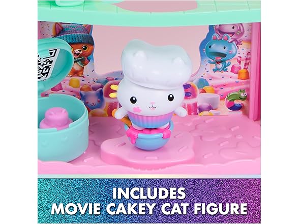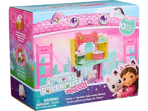 - Gabby Movie Magic: Cakey’s Sprinkle Cake-tastic Kitchen is a 10-piece Gabby’s Dollhouse playset that includes 8 accessories and a Cakey figure, to inspire pretend play and creativity