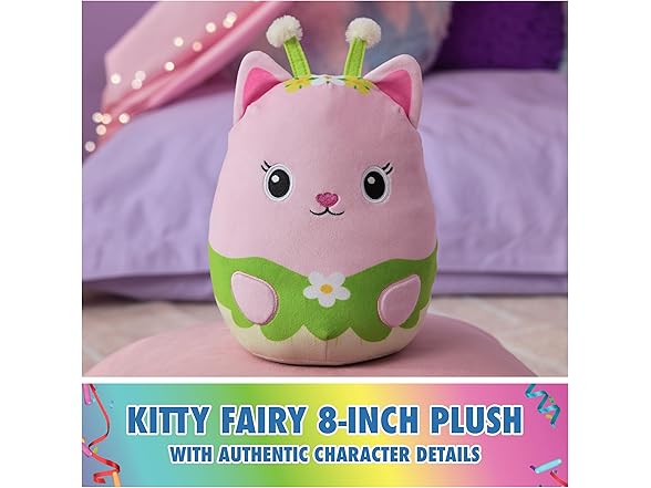 - FLOWER-RIFICALLY HUGGABLE: Fairy-tastic Kitty Fairy, the tiny pink kitty-with-a-plan, is here as a huggable, squishable 8” plush toy She has soft pink plush, dainty fairy wings, and fuzzy plush flower pom poms