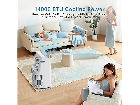 - Powerful Cooling: With an ASHRAE rating of 14000 BTUs, this portable AC efficiently cools spaces between 550-750 sq.ft, providing rapid and effective cooling