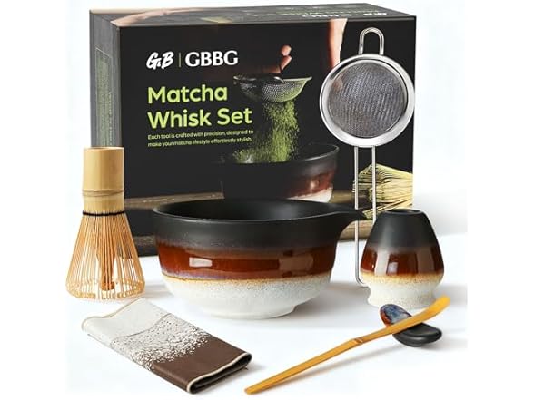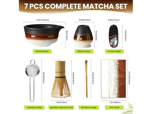 - 7-Piece Matcha Tool Set in Desert Series: This set includes essential tools for creating an authentic matcha experience: 1* Matcha Bowl in Desert Series (530ml/18oz), 1* Chasen Stand in Desert Series, 1* Bamboo Matcha Whisk, 1* Tea Towel, 1* Stainless Steel Tea Powder Sifter, 1* Bamboo Tea Scoop, 1* Tea Scoop Holder in Desert Series. Perfect for crafting healthy breakfast beverages like matcha lattes and matcha milk.