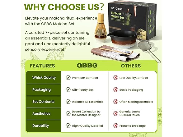 - Ceramic Matcha Set Desert Series: Our GBBG Matcha Whisk Set draws inspiration from the rugged beauty of deserts and earthy tones. Crafted using reactive glazing techniques, the matte glaze seamlessly blends with the textured surface, creating a striking visual effect. Subtle variations in color make each piece a truly one-of-a-kind work of art. More than just a matcha set kit, it doubles as a kitchen accent with bohemian aesthetic appeal.