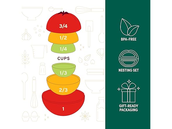 - INCLUDES 6 MEASUREMENTS: The set includes six standard dry measuring cups: 1/4 cup, 1/3 cup, 1/2 cup, 2/3 cup, 3/4 cup, and 1 cup. Each piece nests neatly inside the others, making it as practical as it is playful.