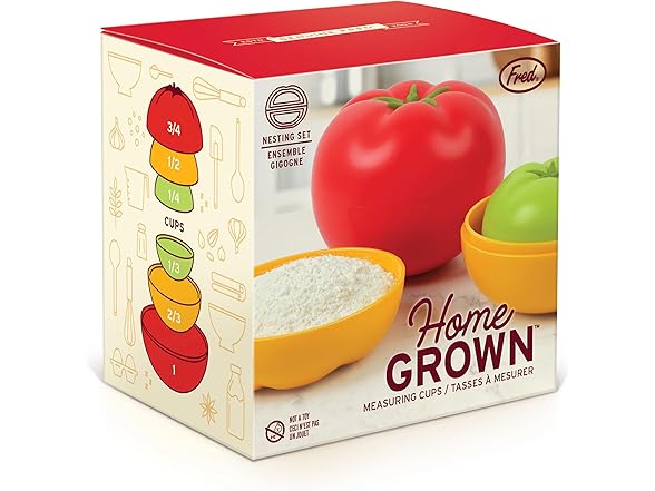 - FUN & FUNCTIONAL: Add a dash of garden-fresh charm to your kitchen with Fred’s Home Grown measuring cups. This clever nesting set is inspired by heirloom tomatoes and makes everyday cooking feel a little more homegrown.