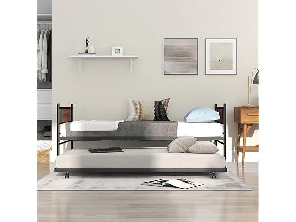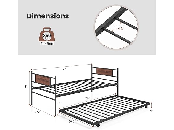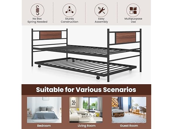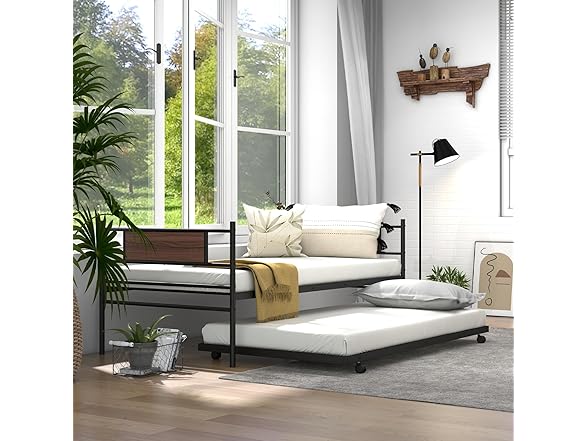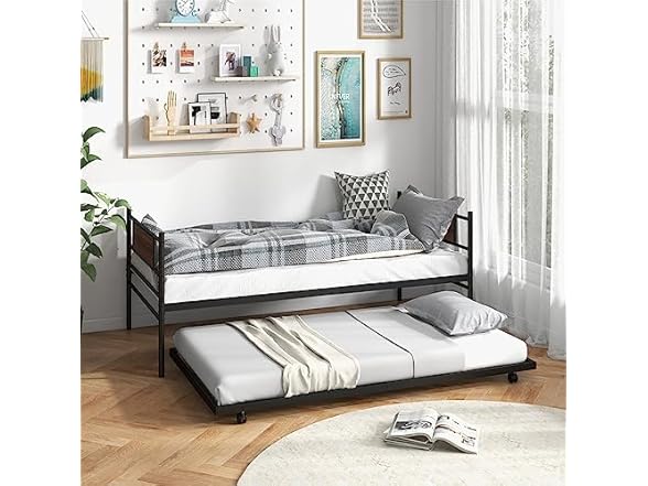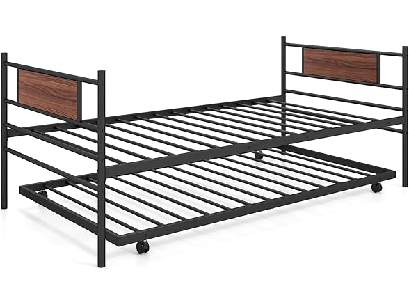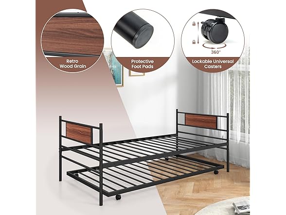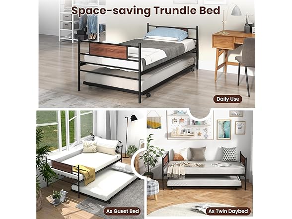Giantex Metal Daybed with Trundle, Twin Size Day Bed with Wood Grain Headboard & Metal Slat Support, Space-Saving Trundle Sofa Bed for Living Room Guest Room, Easy Assembly, No Box Spring Needed
