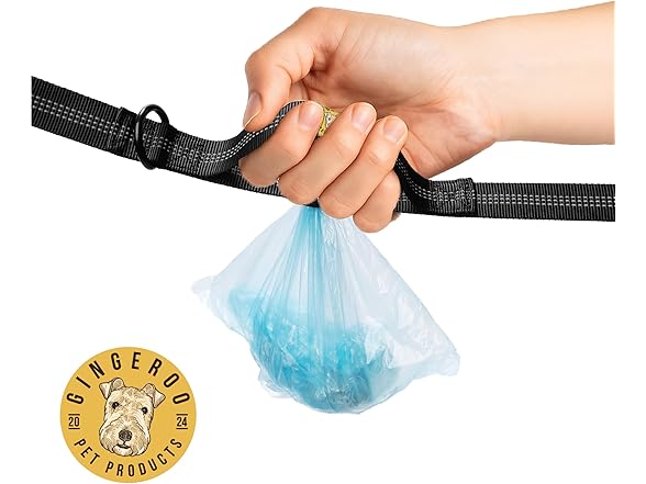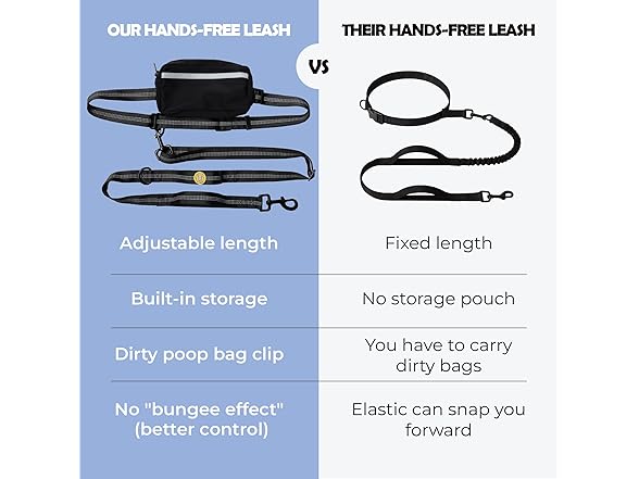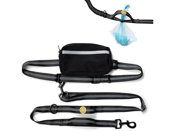 - Unique Poop Bag Management System: The pouch on this waist dog leash can hold a bunch of bags; And about halfway down (far from your nose) the hand free dog leash there's a spot to hang used bags