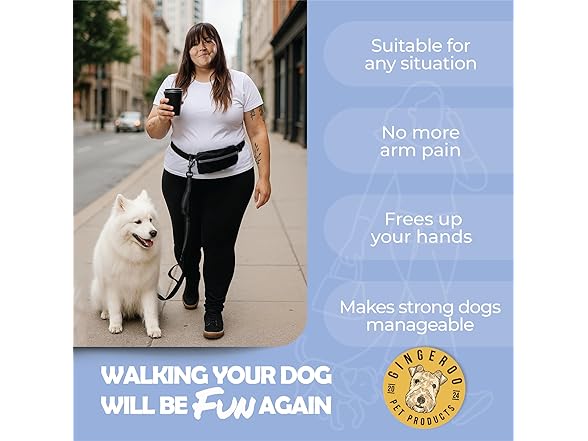I used to think aching arms after walks were just part of the dog owner experience. Little did I know. My dog isn’t badly behaved, she just gets excited about life and is always ready to investigate the next interesting smell. Between my sensitive joints and her natural pulling, our daily walks were turning into a workout. I had tried out a few different no-pull harnesses and hands-free leashes, but none worked quite as I had hoped. But all of those different solutions inspired me to develop this handless dog leash. I was confident that if I could figure out a way to move the attachment point from my hand to my waist, many of the issues I was having would be solved. I was right. This around the waist dog leash has made walks so much more comfortable and enjoyable - for both of us! Here’s what makes this no hands dog leash a bit different than others out there: Won’t dig into your waist, so you can wear it for hours Great for walking, jogging, running, hiking & more Adjustable leash length & waist (fits most men & women) Zippered pouch for fresh poop bags & your things Used bag clip positioned halfway down the leash 360° swivel clip puts an end to leash twisting Once you start using this dog walking belt, your walks will turn into what they were always meant to be: quality time together instead of a battle of wills. Your body will feel better, you’ll have more control and comfort, and you’ll turn into the pack leader that your dog wants you to be. Sound like something you'd like to experience?