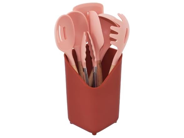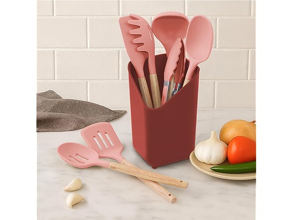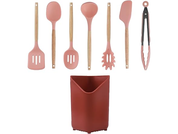 Glad Silicone Kitchen Utensils Set, 8pcs - Nonstick Cooking Tools with Wooden Handles and Utensil Holder - Spatula Set with Turner, Ladle, Spoons, Tongs, and Spaghetti Server - Rust