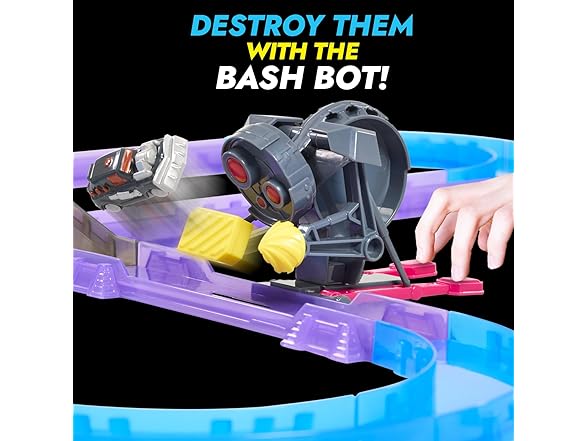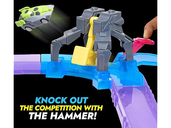 - BATTLE ROYALE: Hyper Burst changes the objective from being the fastest to being the last car to survive the track! Launch your car anywhere along the Shockout Circuit track and get ready to knock out your opponent with the BASH BOT and the HAMMER Battle Traps!