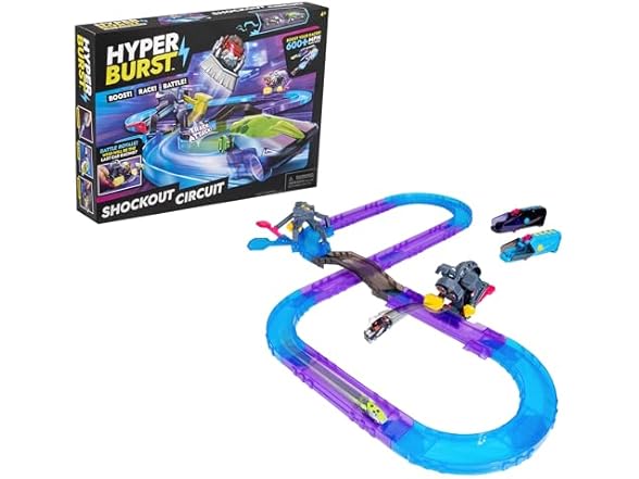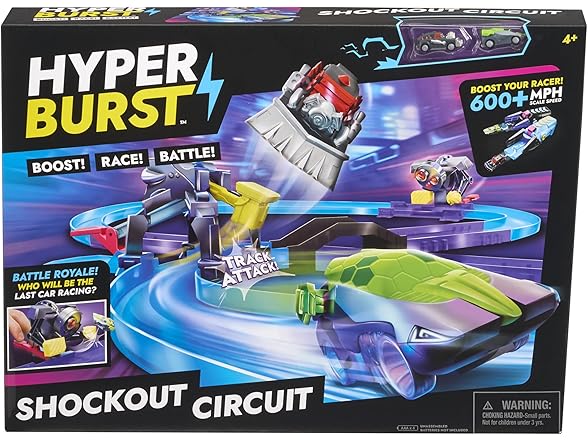 Boost! Race! Battle! Hyper Burst combines traditional vehicle racing play with battle action in a refreshing way! Inspired by the ‘battle royale’ gameplay popularized by video games, Hyper Burst changes the objective from being the fastest to being the last car to survive the track! The cars are Micro Scale - charge up your car and race at over 600+ MPH scale speed! Then battle your way to victory as you knock out your opponent with the battle traps and become the ultimate Hyper Burst champion! The Shockout Circuit set includes 2 Micro Scale Cars, 2 Launchers, 5 Corner Tracks, 4 Straight Tracks, 1 Bridge Track, 2 Knock-Out Battle Traps, 12 Connectors, and 4 Replacement Tires. Note: requires 4 x AAA batteries (not included).