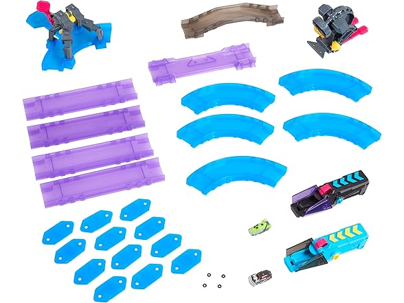 - INCLUDES: 2 Micro Scale Cars, 2 Launchers, 5 Corner Tracks, 4 Straight Tracks, 1 Bridge Track, 2 Knock-Out Battle Traps, 12 Connectors, and 4 Replacement Tires. Requires 4 x AAA batteries (not included).