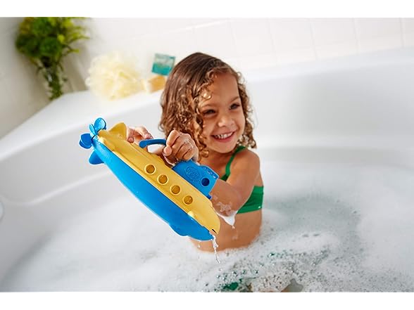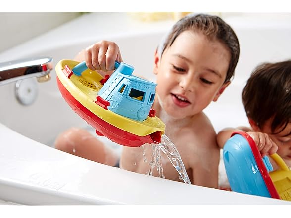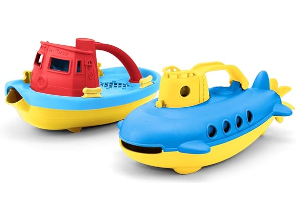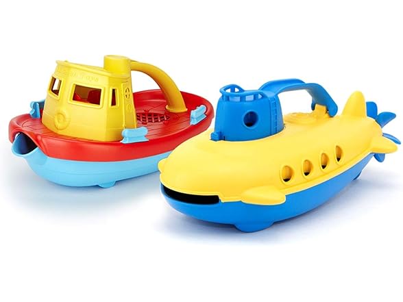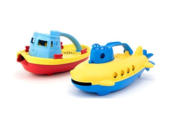 Take the helm for a nautical journey to help protect the planet! Embark on a cruise across the bathtub! Navigate the wading pool, or even splash around in the occasional mud Puddle. There's no end to the good green fun young sailors can have with the Green Toys tugboat and submarine. These colorful crafts float Great, and have handles and spouts to scoop and pour water. Made in the USA from 100% recycled plastic milk containers that save energy and reduce greenhouse gas emissions, our trusty toys is both good for the earth, and - most importantly - safe for the busy little folks who play There. No BPA, phthalates, PVC. Dishwasher safe. Color combinations may vary.